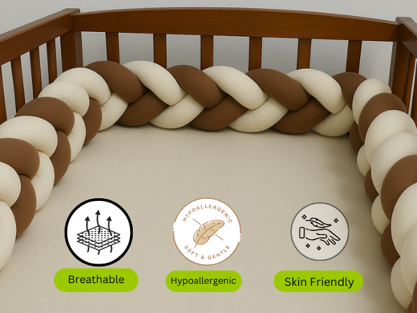 The Crib Protector Bumper is made from high-quality, hypoallergenic, and soft cotton fabric with breathable polyester filling.